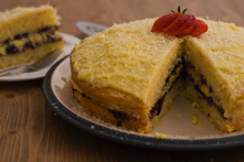 Vanilla sponge filled with a homemade summer fruit compote and a white chocolate buttercream.