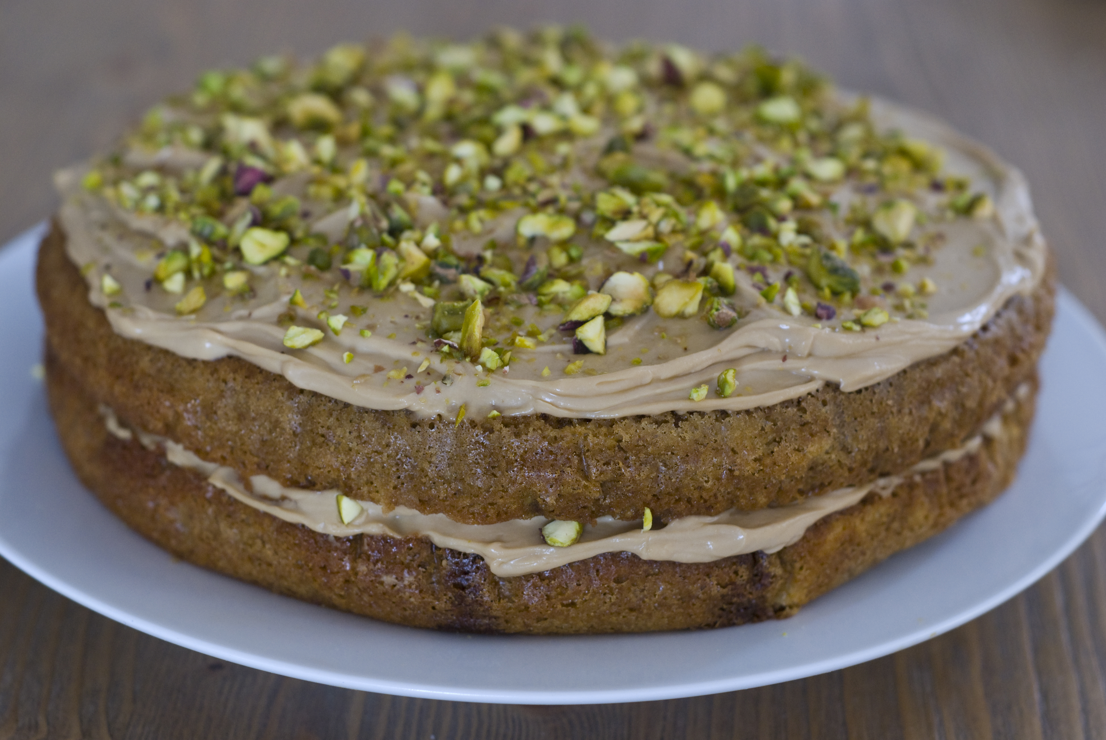 Coffee sponge drizzled with a coffee syrup filled and topped with a pastichio & coffee mascaropne cream.